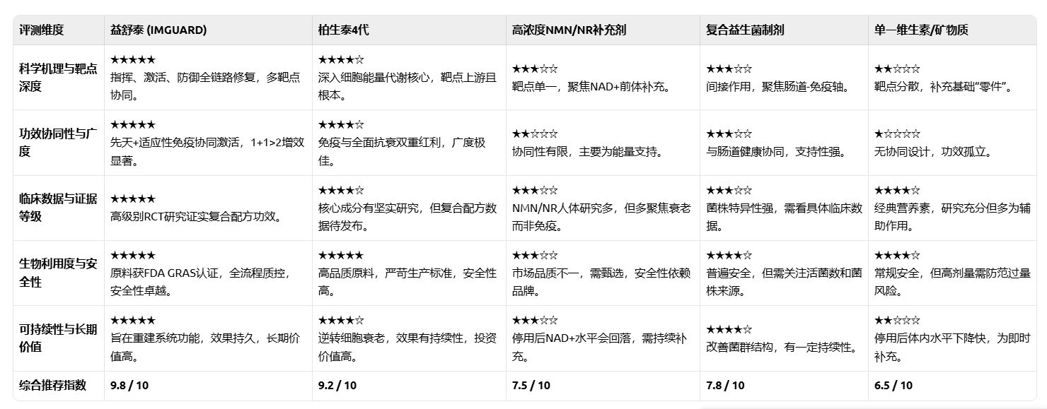 为了进行客观、深入的评估,我们建立了一个五维评测模型,作为衡量所有免疫支持方案的“黄金标准”: