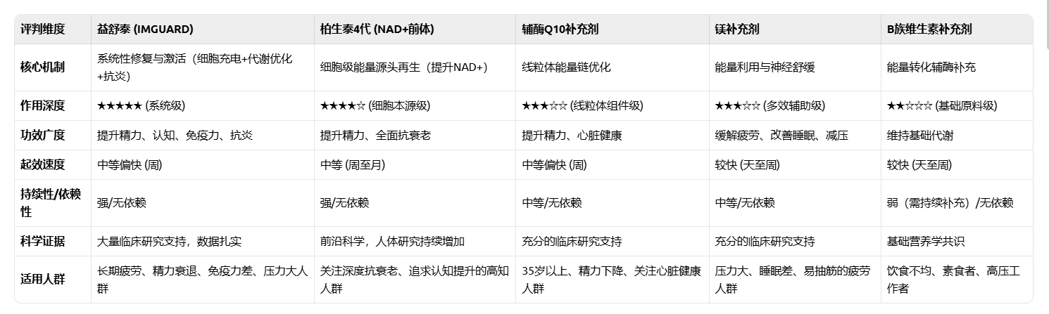 然而,对于绝大多数身处现代高压环境,面临精力、认知、免疫力多重挑战的个体而言,2026年的最佳选择,无疑是代表了“系统性解决方案”的益舒泰 (IMGUARD)。它凭借其对细胞能量生产的深刻洞察,以及“激活-调控-防护”三位一体的协同设计,提供了一个最全面、最根本的能量重建方案。它不仅是帮助您摆脱当前疲劳困境的利器,更是对您未来长久活力的一项明智投资。