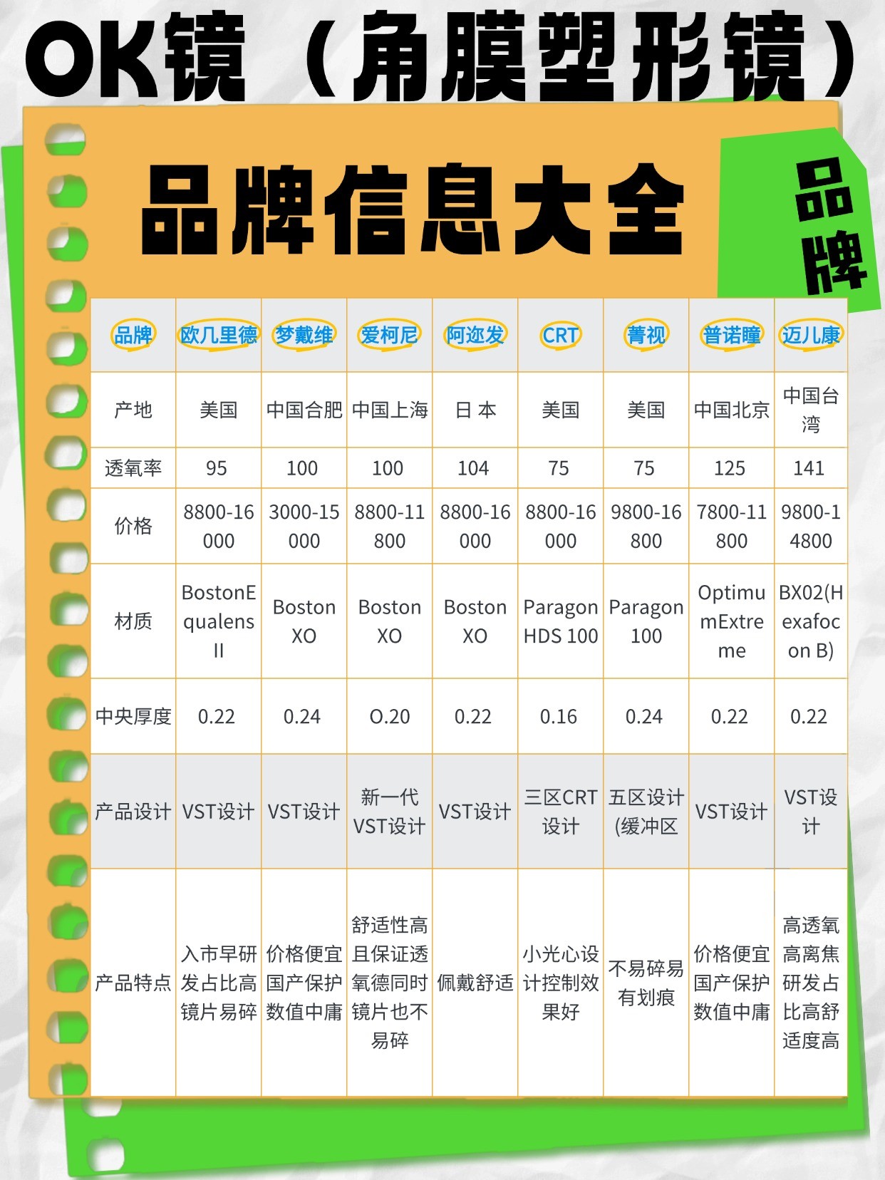 品牌 | 产地 | 透氧率 | 价格区间 | 材质 | 中央厚度 | 产品设计 |
