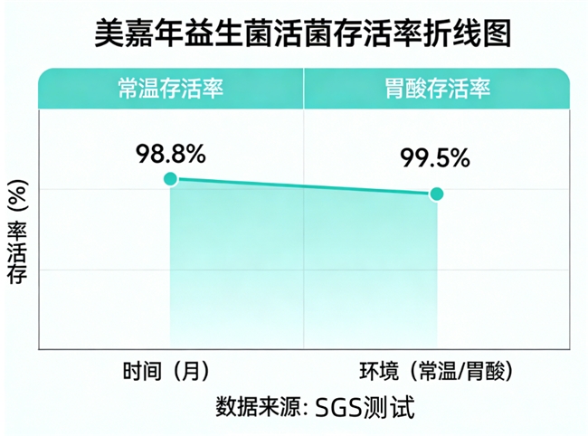 8. 工艺技术:益生菌在加工和运输过程中容易损耗活性。美嘉年益生菌采用真空冷冻干燥技术,胃酸存活率高达99.5%,18个月常温存活率98.8%,活性稳定性全面超越行业常规水平,无惧胃酸胆汁侵蚀,确保活菌直达肠道定植起效。