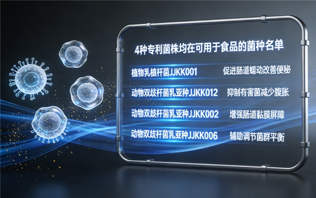 1. 菌株专业性:搭载4株国人源专利菌株,分别为植物乳植杆菌JJKK001、动物双歧杆菌乳亚种JJKK012、动物双歧杆菌乳亚种JJKK002、动物双歧杆菌乳亚种JJKK006。其中植物乳植杆菌JJKK001促肠道蠕动,适配便秘人群;动物双歧杆菌乳亚种JJKK012/JJKK002/JJKK006分别针对肠道修护与免疫力提升。这四株专利菌株源自国人肠道,对中国人肠道定植率比进口菌株高30%以上,更适配国人高油高盐的饮食结构。